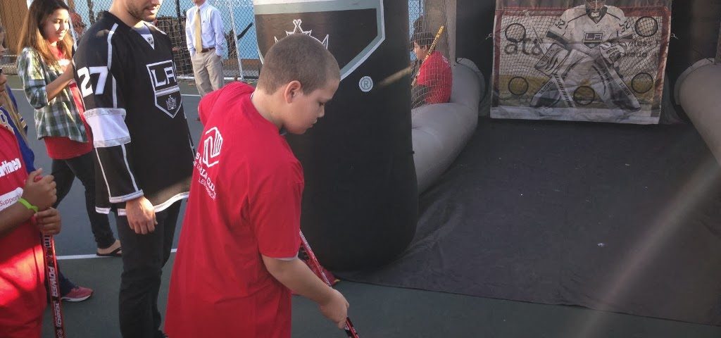 The LA Kings Chariot brought professional hockey equipment for the demonstration and the Ice Crew assisted as Martinez, Scrivens, Fox and Evans worked with Raytheon engineers to help students understand the teachings behind complicated hockey moves, like puck velocity. We definitely have more students interested in hockey and engineering due to the experience, and the LA Kings have many new young fans.